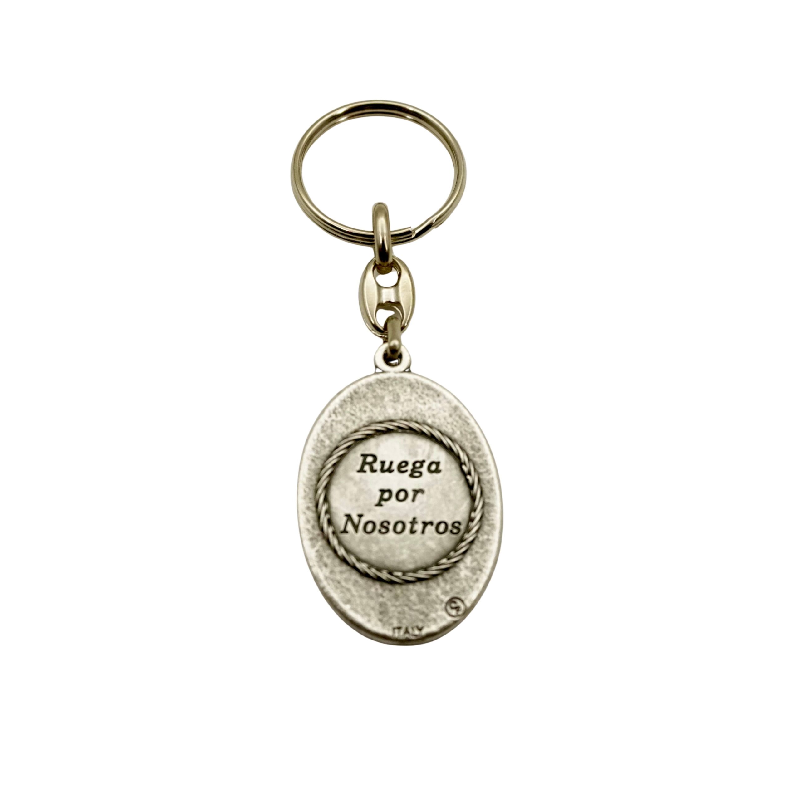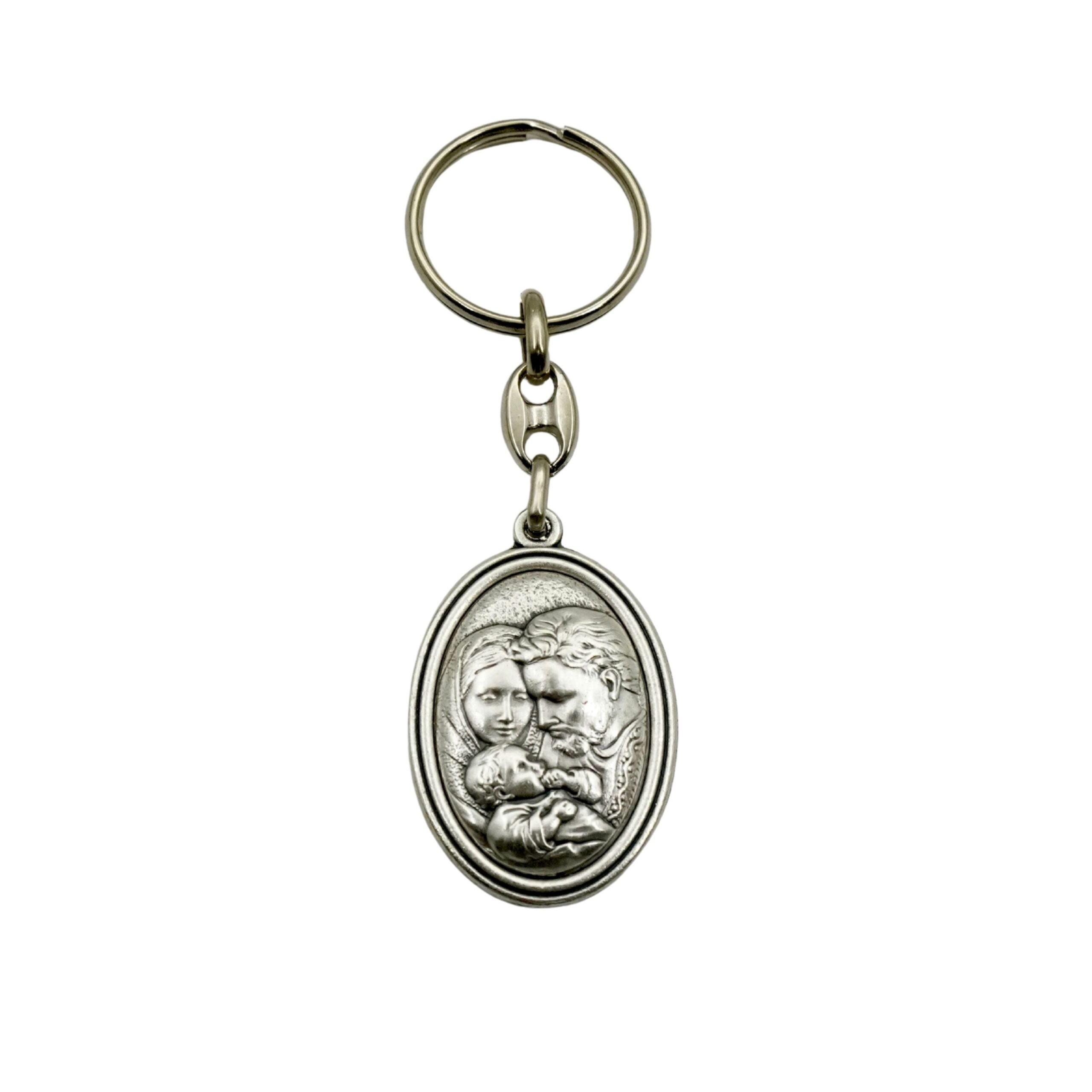 Llavero con la medalla de la Sagrada Familia, anillo con la imagen de María, José y el Niño Jesús, oración religiosa en plata.