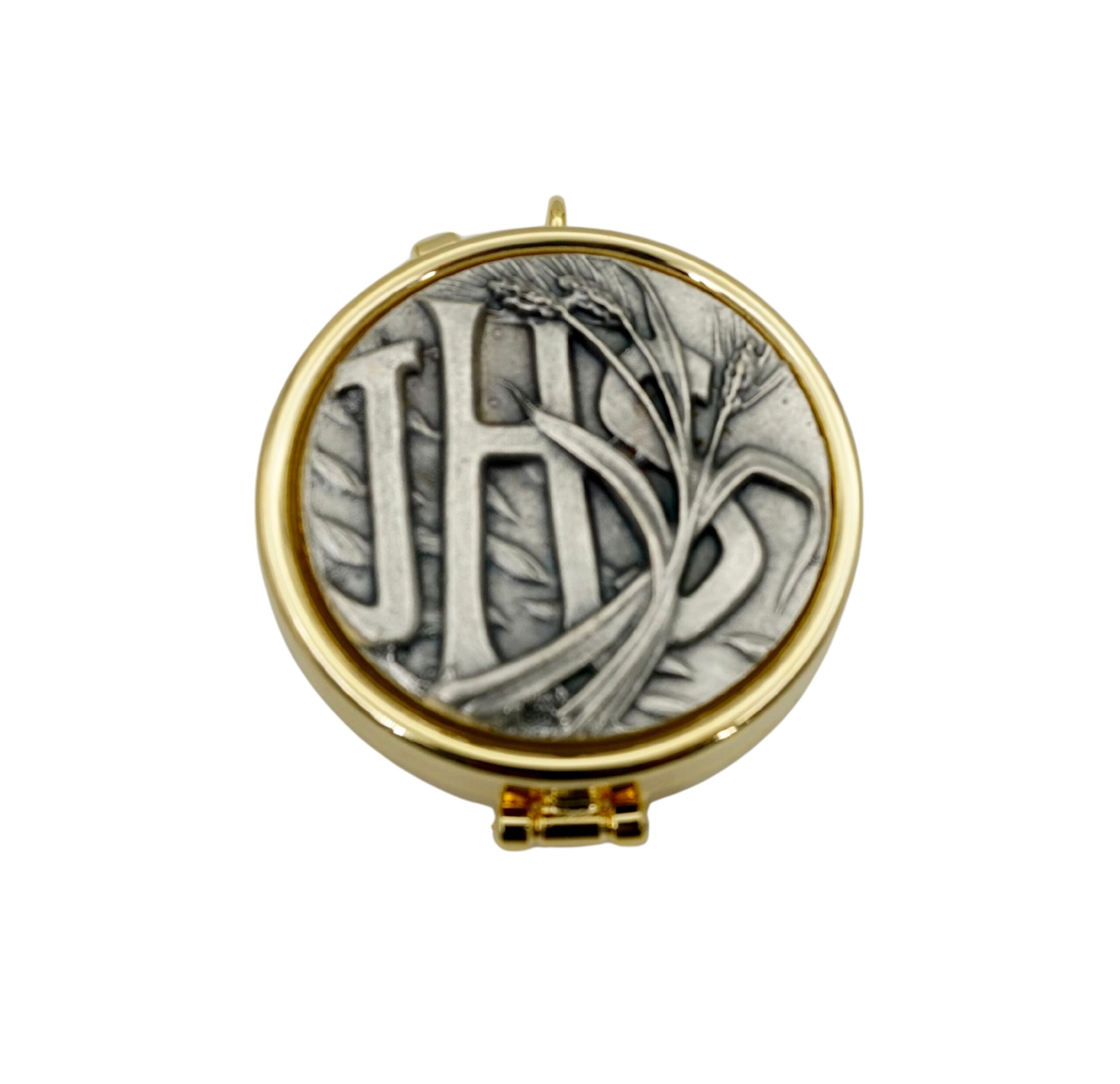Portaviáticos litúrgico con diseño simbólico, decorado con una placa de peltro en altorrelieve que presenta el monograma “JHS” entrelazado con espigas de trigo.