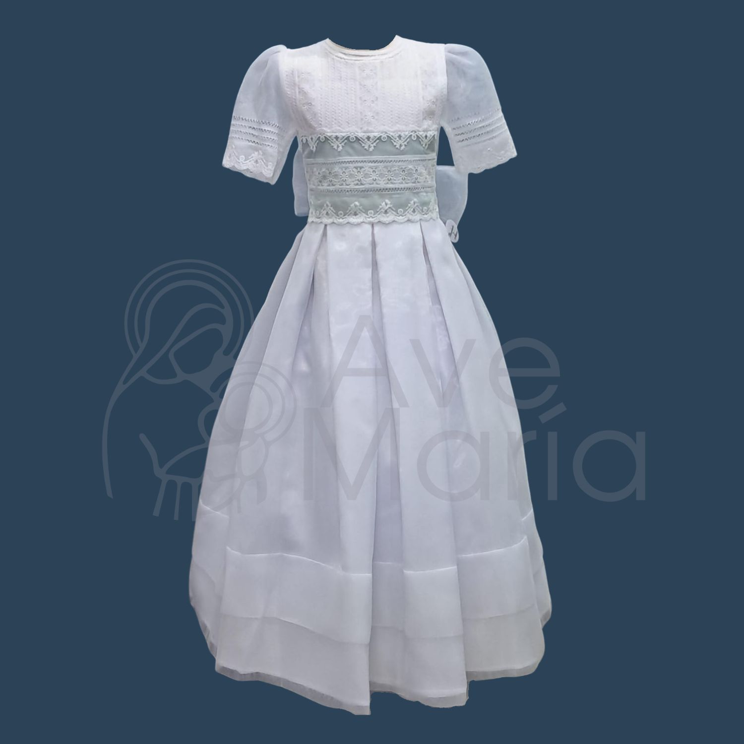 VESTIDOS ORGANZA CON ENCANJE RUSIA T 10 BLANCO CON FRANJA VERDE